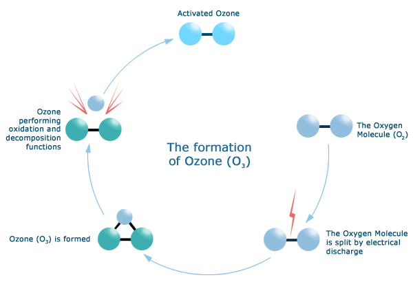 Some oxygen (O2) molecules split up leaving two oxygen atoms (O and O, not O2). These oxygen atoms then join to other oxygen molecules (O2) to form an ozone molecule (O3), oxidise a pollutant nearby or join together again with a free oxygen atom to form the regular oxygen molecule (O2). The additional oxygen atom in the ozone (O3) molecule splits off to oxidise a pollutant - leaving behind O2, the air we breathe.